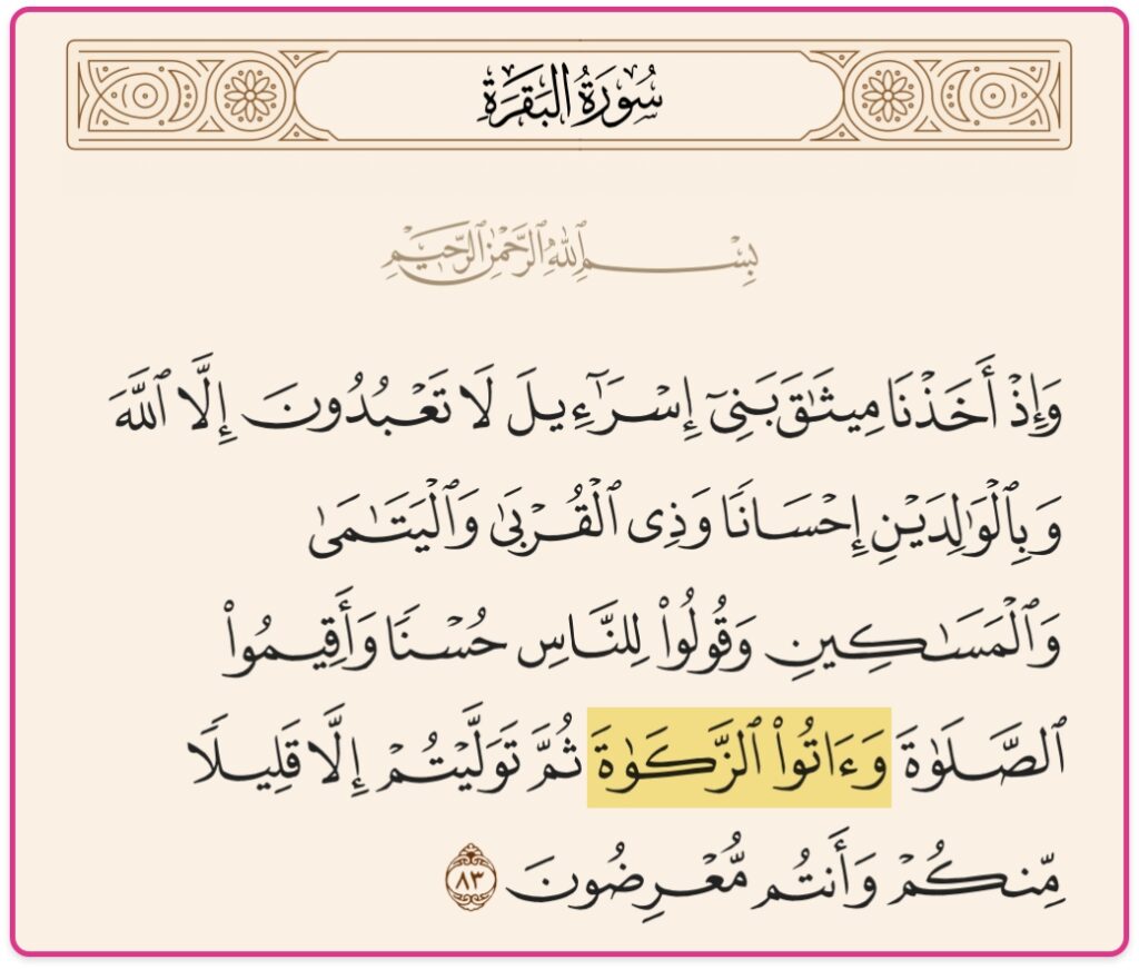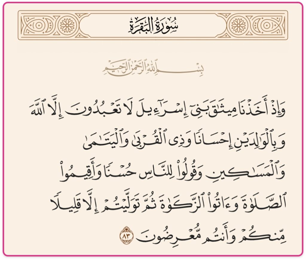 ﴿وَإِذْ أَخَذْنَا مِيثَاقَ بَنِي إِسْرَائِيلَ لَا تَعْبُدُونَ إِلَّا اللَّهَ وَبِالْوَالِدَيْنِ إِحْسَانًا وَذِي الْقُرْبَى وَالْيَتَامَى وَالْمَسَاكِينِ وَقُولُوا لِلنَّاسِ حُسْنًا وَأَقِيمُوا الصَّلَاةَ وَآتُوا الزَّكَاةَ﴾ [البقرة: 83]